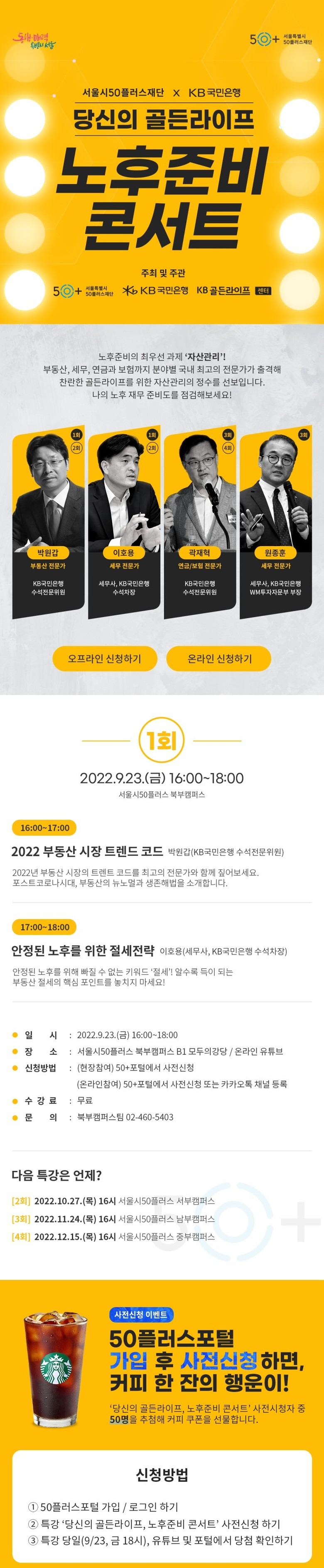 서울시50플러스재단은 중장년층의 성공적인 노후 준비를 지원하기 위해 KB국민은행과 협력해 자산관리 전문가들의 특강으로 구성된 ‘노후준비 콘서트’를 개최한다.