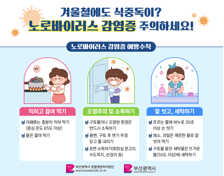 노로바이러스 감염증은 주로 겨울철에서 이듬해 초봄(11월~4월)까지 발생한다. 실제 지난해 부산 지역 노로바이러스 감염증 환자의 92퍼센트(%)가 이 시기에 집중됐다.
