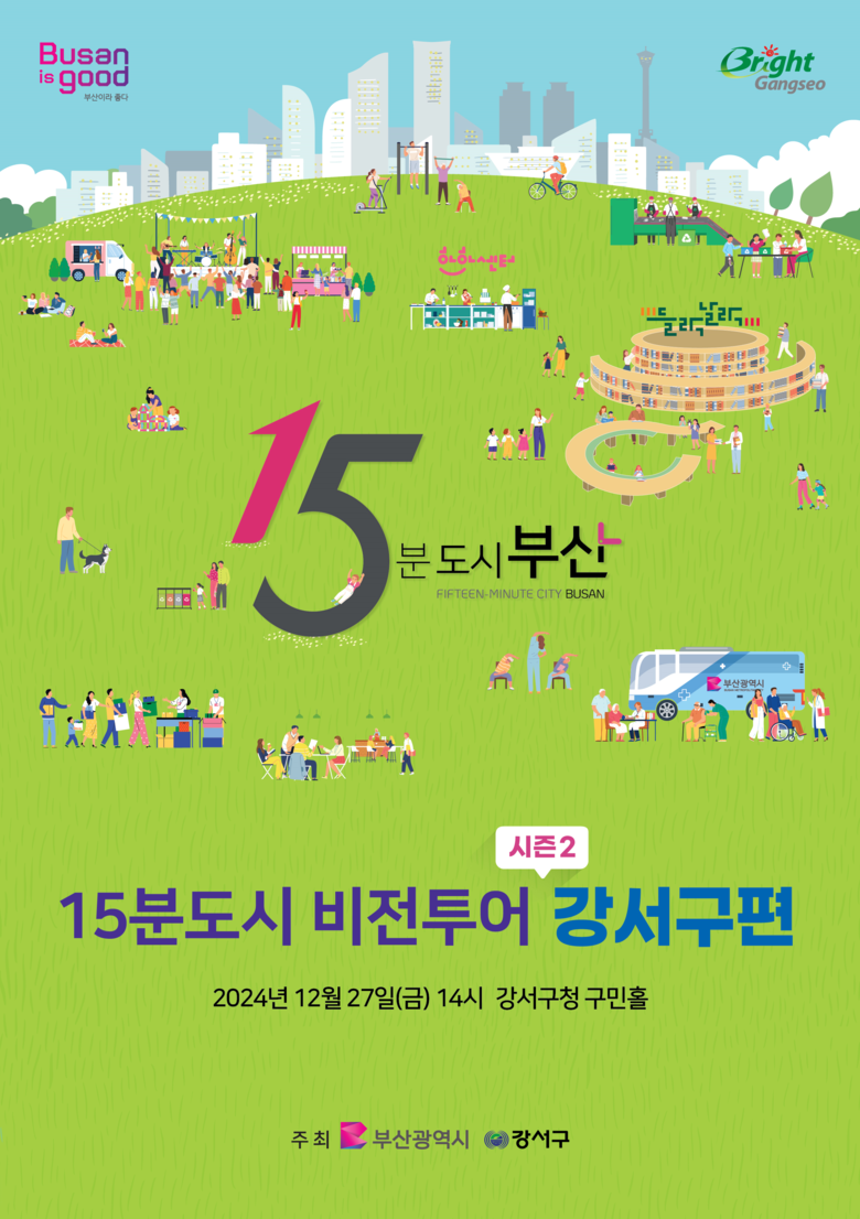 ◈ ▲1부 '시민이 제안하는 15분도시 강서구' ▲2부 '시민과 함께 나누는 강서구 이야기' 순으로 진행… 시민 제안 과제는 '에코델타복지타운 건립' [부산 세계타임즈=이용우 기자] 부산시(시장 박형준)는 오늘(27일) 오후 2시 강서구청 1층 구민홀에서 「15분도시 비전투어시즌2 강서구 편」을 개최한다고 밝혔다.