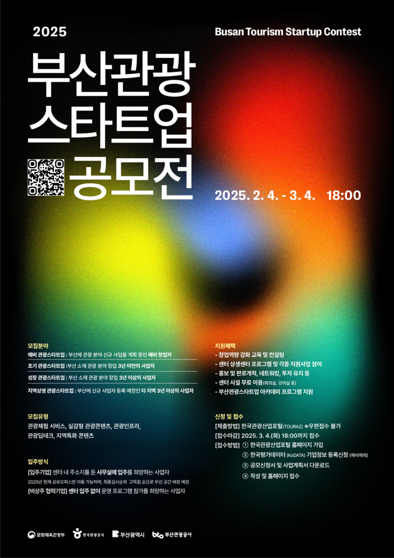 김현재 시 관광마이스국장은 “2019년부터 추진된 '부산관광스타트업 공모전'을 통해 지난해(2024년)까지 총 155개의 관광기업이 공사와 협약을 체결했으며, 다수의 기업이 성공적으로 자리 잡아 지역 관광산업 활성화에 기여하고 있다”라며, “올해는 관광 신생기업(스타트업) 생태계를 견고하게 구축할 수 있도록 맞춤형 지원을 강화할 예정으로, 이번 공모전에 많은 관심과 참여를 부탁드린다”라고 전했다.