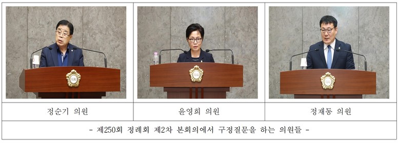 [금천구 세계타임즈=이장성 기자] 서울특별시 금천구의회(의장 김용술) 정순기·윤영희·정재동 의원이 6월 25일, 제250회 1차 정례회 제2차 본회의에서 일괄질문 일괄답변 방식으로 구정 현안에 대해 질문을 했다.