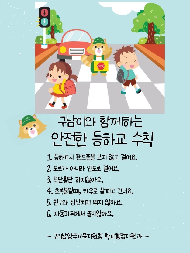 한편 구리남양주교육지원청 학교행정지원과에서는 학생들의 안전한 등하굣길 조성을 위하여 다양한 캠페인을 진행 중이며 ‘구남이와 함께하는 안전한 등하교 수칙’ 등을 홈페이지에 게시하고, 교통안전 수칙이 담긴 안전 노트를 제작하여 캠페인 시 학생들에게 배부하는 등 학생들의 행복한 학교생활을 위하여 노력하고 있다.