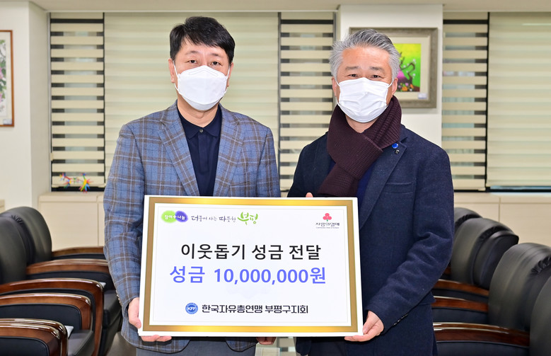[부평구 세계타임즈=심하린 기자] 부평구(구청장 차준택)는 지난 30일 한국자유총연맹 부평구지회로부터 어려운 이웃을 위한 이웃돕기 성금 1천만 원을 전달받았다.