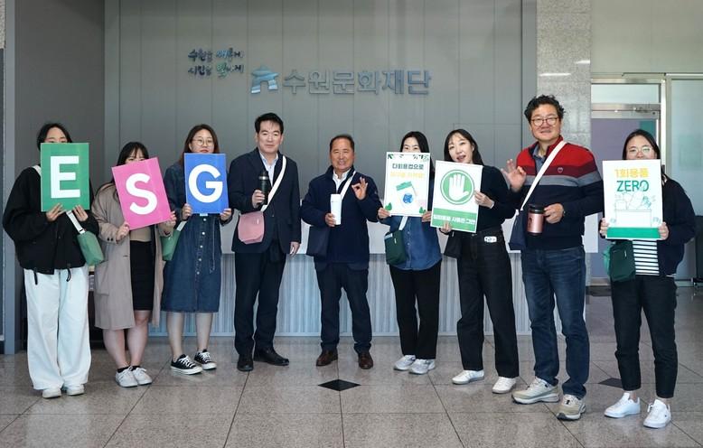 수원문화재단 김현광 대표이사를 비롯한 임직원 9명은 20일 오후 1시 청사 입구에서 재단 직원들을 대상으로 ‘다회용컵 사용 활성화’ 캠페인을 진행했다.