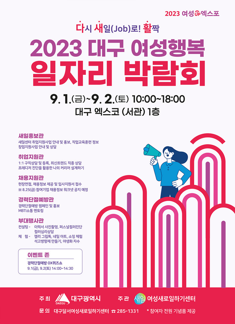 ▸ (주)메가젠임플란트, ㈜티에이치엔, ㈜비젼사이언스 등 82개 기업체 참여 [세계타임즈=대구 한성국 기자] 대구광역시에서 미취업 여성들에게 취업 기회를 제공하기 위해 오는 9월 1일(금)~ 9월 2일(토) 양일간 여성UP엑스포와 연계해 엑스코(북구 소재) 서관(1층)에서 ‘2023 대구 여성행복 일자리 박람회’를 개최한다.