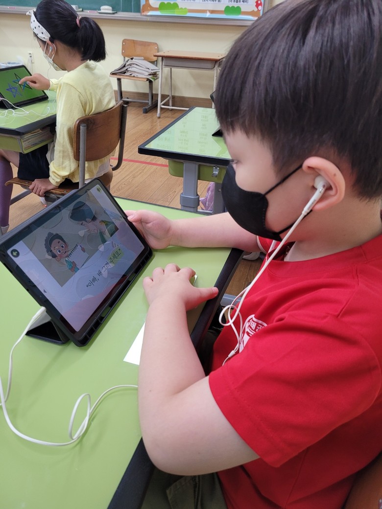 아침 활동시간 및 국어시간에 테블릿을 활용하여 개인 맞춤형 학습 플랫폼인‘토도한글’ 앱을 사용하고 있다.