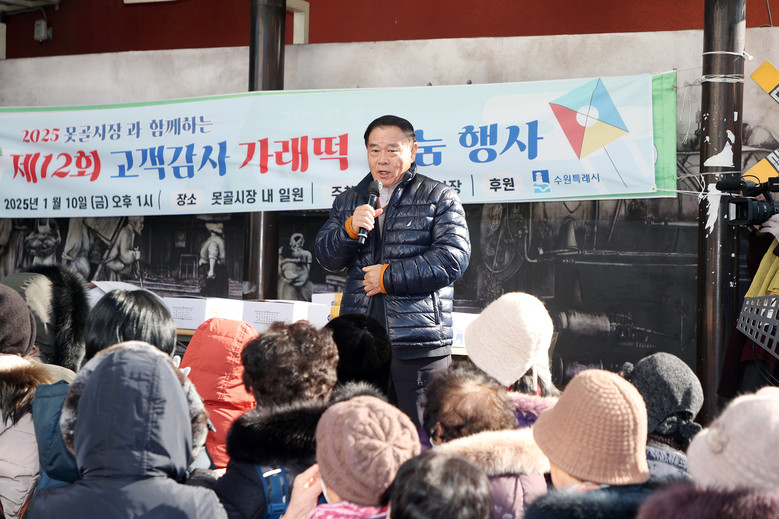 [수원시 세계타임즈=송민수 기자] 수원특례시의회(의장 이재식)가 10일(금) 수원 못골종합시장 및 야외무대에서 열린 2025 가래떡 나눔 행사에 참석했다.