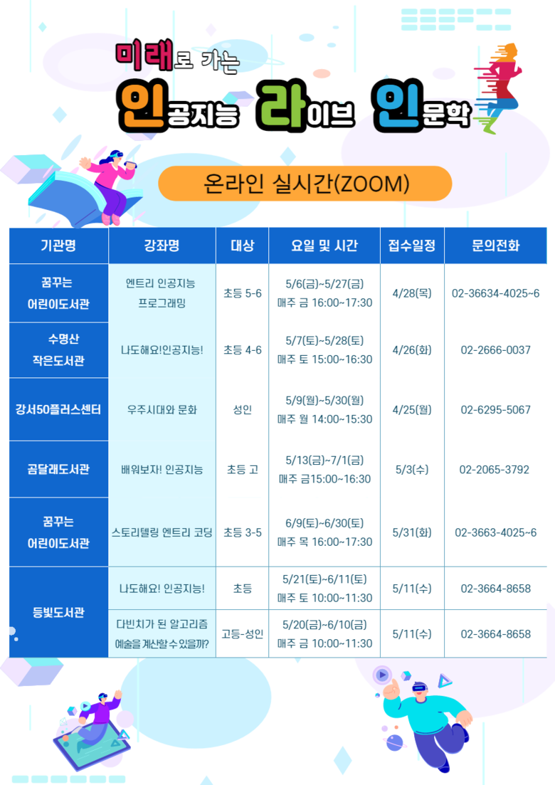 구 관계자는 “일상생활 속 가까워진 인공지능 시대에 인문학을 통해 우리가 살아가는 해법을 찾기 위해 이번 강좌를 마련했다”라며, “인공지능 인문학에 관심 있는 주민들의 많은 참여를 바란다“라고 말했다.