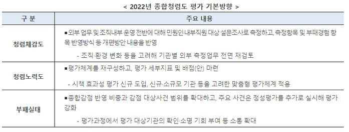 반부패 정책 중점 추진방향 및 취약분야 개선 등의 내용을 담은 ▴반부패 추진계획 수립·이행 ▴기관장·고위직 노력과 리더십 ▴부패방지 제도개선 권고 과제 이행 등 부패방지 제도 구축 ▴청렴 교육 실효성 제고 ▴부패·공익신고자 보호 노력 등 청렴도 제고에 핵심적인 기존 지표는 배점을 상향하거나 평가기준을 보완해 강화한다.
