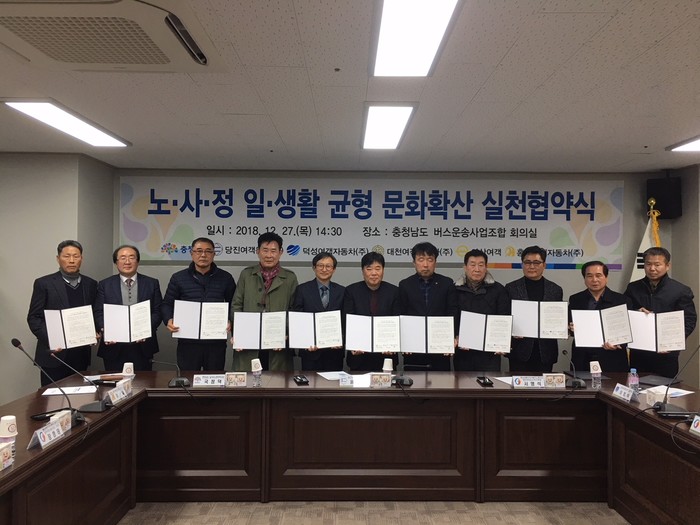 도는 27일 충남버스운송사업조합 회의실에서 당진여객운수, 덕성여객자동차, 대천여객자동차, 아산여객, 홍주여객자동차 등 도내 시내버스 5개사와 ‘일·생활 균형 문화 확산 실천 협약’을 체결했다.