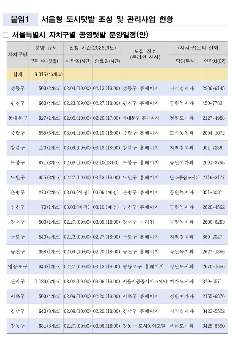 - 어린이텃밭·치유텃밭 및 가정에서 도시농업 체험 가능한 상자텃밭 23,000세트 보급 [서울 세계타임즈=이장성 기자] 서울특별시(이하 ‘서울시’라 함)는 오는 2월 3일부터, 관악구 등 17개 자치구가 운영하는 공영텃밭(사업명: 자투리텃밭) 46개소 총 9,016구획을 시민들에게 분양한다고 밝혔다.