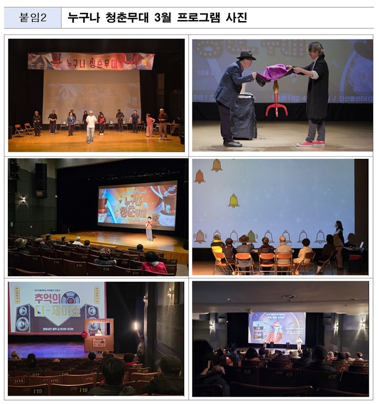 ‘누구나 청춘무대’는 기존 영화 관람 중심의 ‘청춘극장’을 참여형 콘텐츠 중심으로 개편한 사업으로, 지난 3월 3일 정식 운영을 시작한 이후 높은 이용률을 보이며 도심 속 어르신 문화쉼터로 자리매김하고 있다. 또한 프로그램 운영에 반영하기 위해 현장 참여자 의견을 지속적으로 수렴하고 있다.