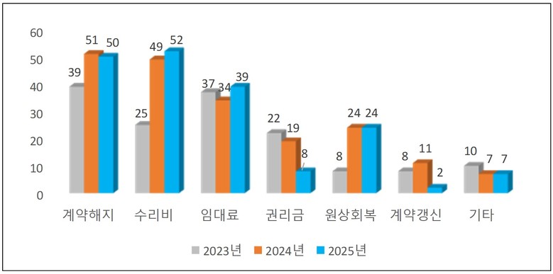 지난해 접수된 분쟁 유형을 살펴보면 ‘수리비(누수 포함)’ 관련 분쟁이 52건으로 가장 많았고, ▴계약해지(50건) ▴임대료(39건) ▴원상회복(24건) 순으로 책임 범위와 비용 부담을 둘러싼 분쟁이 다수를 차지했다.