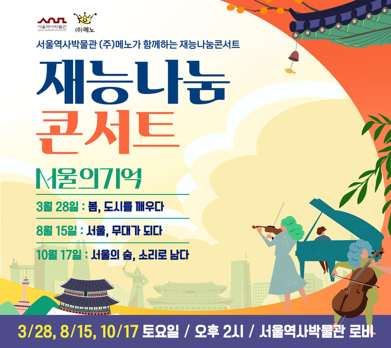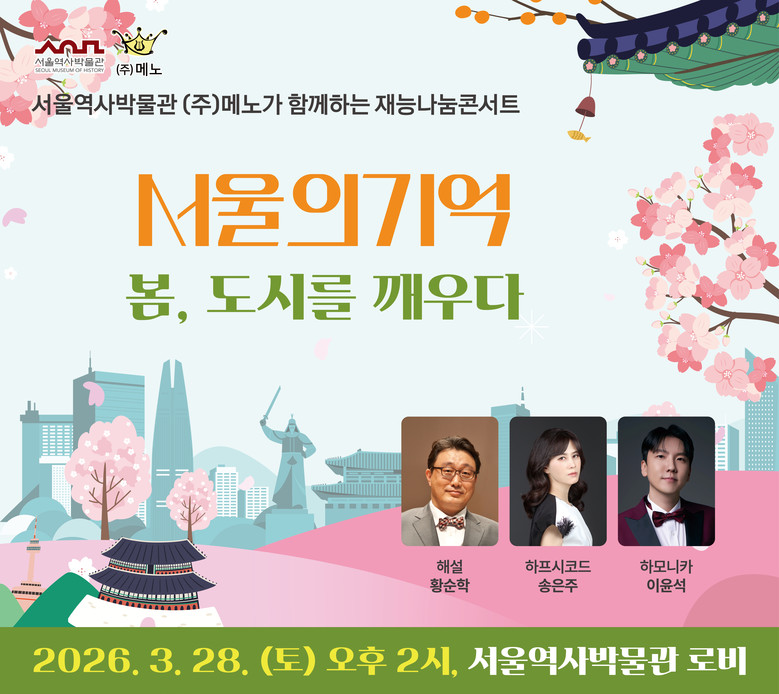 첫 공연은 오는 3월 28일(토) 오후 2시 서울역사박물관 1층 로비에서 개최되며, 봄을 맞는 도시 서울의 감성과 기억 “봄, 도시를 깨우다”를 테마로 하모니카와 하프시코드가 어우러지는 듀오 콘서트로 진행되며, 도시 서울의 감성을 음악으로 표현할 예정이다.