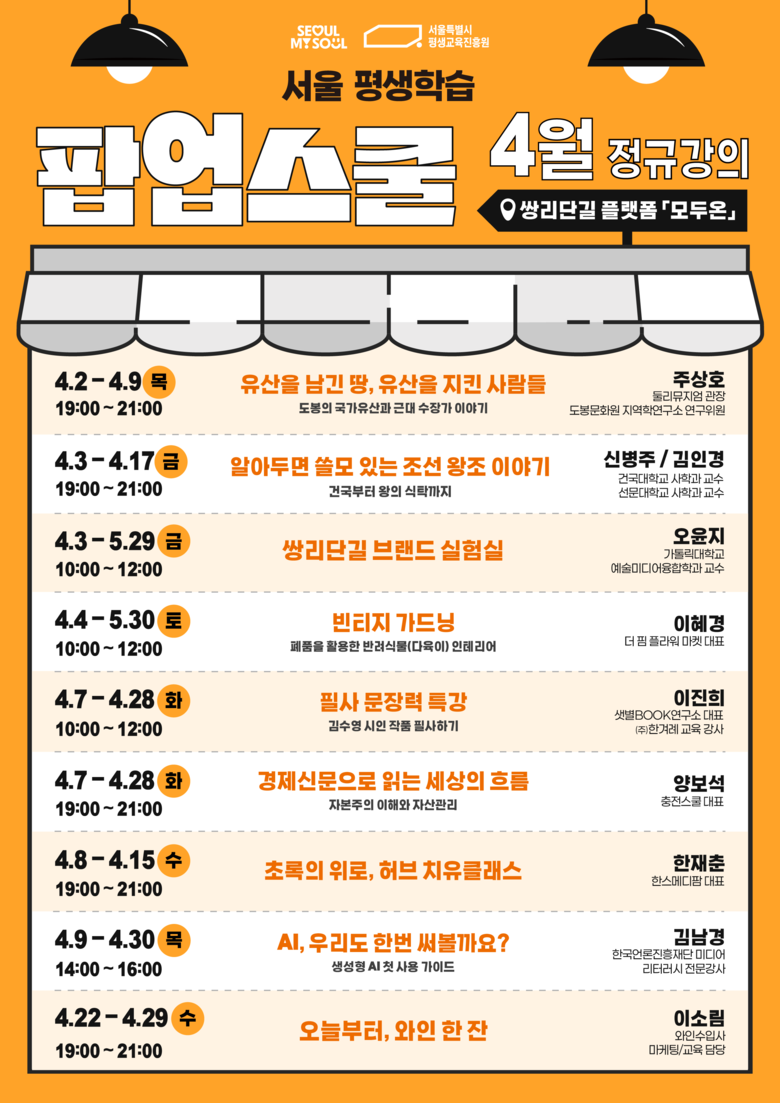 팝업스쿨 프로그램은 ▴정규강좌 ▴명사특강 ▴러닝숍 세 가지 영역으로 구성된다. 4월에는 정규강좌 10개와 명사특강 2개를 먼저 선보인다. 정규강좌 약 250명, 명사특강 약 100명 등, 4월에만 500여 명 규모로 운영될 예정이다.