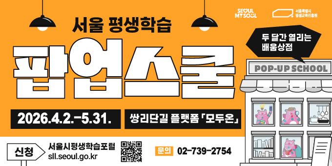 - 생활권 평생학습 모델 실험…시범 운영 성과 분석 후 서울시 내 다른 지역으로 확대 검토 [서울 세계타임즈=이장성 기자] 서울시는 4월 2일(목) 도봉구 쌍문역 인근 시민 오픈 커뮤니티 공간 ‘모두온’에 ‘서울 평생학습 팝업스쿨’을 개관하고 약 2개월간 시범 운영한다고 밝혔다. 이번 사업은 역세권 생활권 내에서 학습이 이뤄지는 새로운 평생학습 모델로, 4월~5월까지 정규강좌와 명사특강 등 총 20개 프로그램을 운영하며 약 1천 명이 참여할 예정이다.
