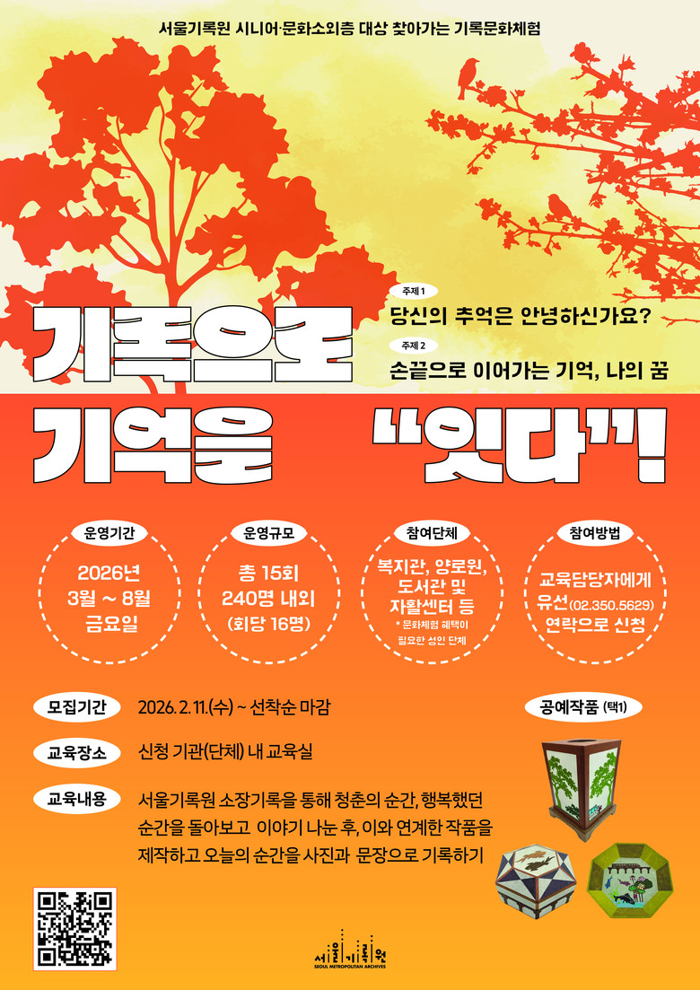 이은주 서울기록원장은 “기록은 특별한 일이 아니라 누구나 일상에서 만들어가는 것”이라며 “이번 프로그램이 시민들이 기록의 가치를 체감하고, 삶 속에서 기록을 실천하는 계기가 되길 기대한다”고 밝혔다.