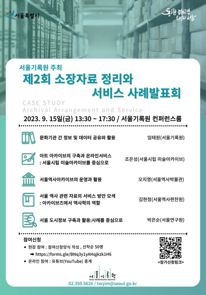 그리고 9월 15일(금) 서울기록원은 원내 5층 컨퍼런스룸에서 ‘제2회 소장자료 정리와 서비스 사례 발표회’를 개최한다. 이번 발표회에서는 서울시 소속 문화기관별 소장자료와 컬렉션 구축 현황을 공유하고, 기관별 온라인 서비스의 상호 연계 방안을 모색할 예정이다.