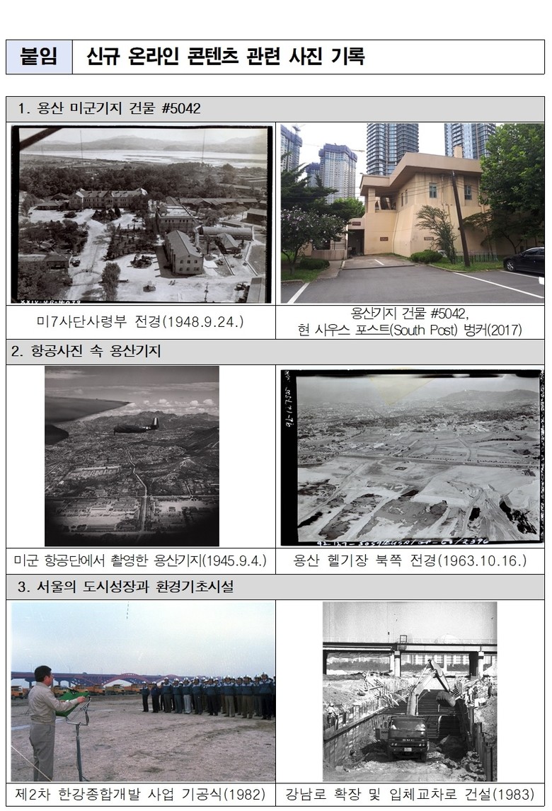 미국 국립문서기록청(NARA)에서 수집한 기록으로 제작한 콘텐츠는 ‘용산기지 건물 #5042’와 ‘항공사진 속 용산기지’이다. ‘용산기지 건물 #5042’는 일제강점기, 6·25전쟁, 5·16군사정변, 12·12사태 등 한국 근현대사의 주요 사건을 고스란히 겪은 장소로 역사적 사건과 이야기를 사진과 문서, 지도로 설명하고 있다. ‘용산기지 건물 #5042’에서 5042는 용산기지 건물의 번호로 건물 명칭으로도 사용한다.