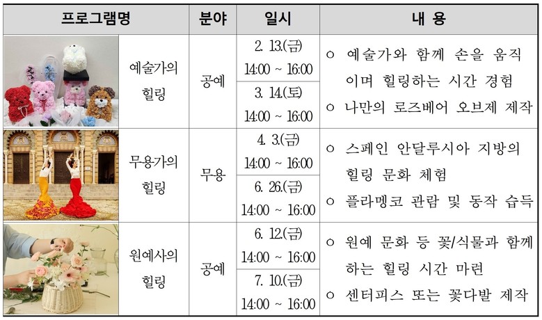 - 2월~7월 예술가·무용가·원예사 등 전문가와 함께하는 6회 프로그램 운영...2월 3일부터 접수 -