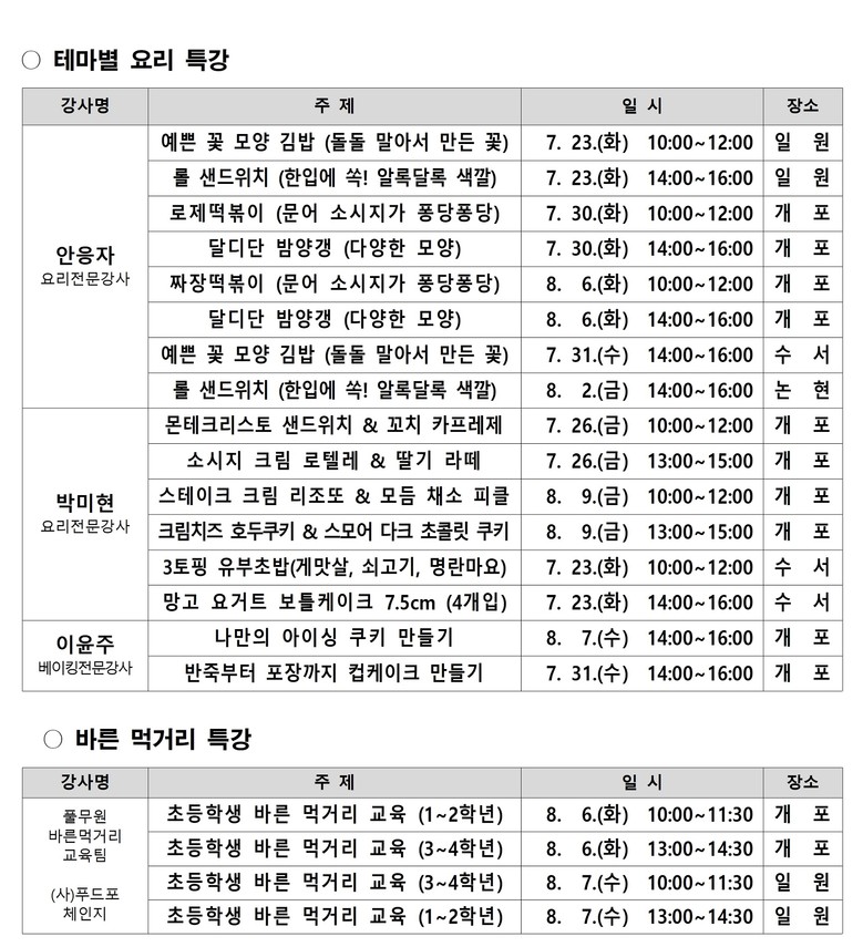 평생학습센터 4개소(일원·개포·수서·논현글로벌)는 7월 23일부터 8월 10일까지 온(溫)가족 여름방학 특강을 연다. 자녀를 둔 부모(조부모)라면 누구나 자녀와 함께 참여할 수 있다. 운영 강좌로 ▲유튜버, 국악가, 조향사, 음악감독 등을 초빙해 직업 세계를 배우는 ‘진로체험’ ▲건강운동관리사가 알려주는 키 크는 스트레칭, 미술치료사와 함께 아이와 소통하는 법을 공부하는 ‘몸&마음챙김’ ▲아빠와 함께 하는 ‘목공체험 교실’ ▲자녀와 부모가 베이킹, 세계요리 등을 만드는 ‘테마별 요리특강’ ▲풀무원과 연계한 ‘바른먹거리 특강’ 등 5개 주제 41개 강좌를 준비했다. 총 600명을 모집하며 각 강좌는 강남구 평생학습 홈페이지에서 선착순 접수한다.