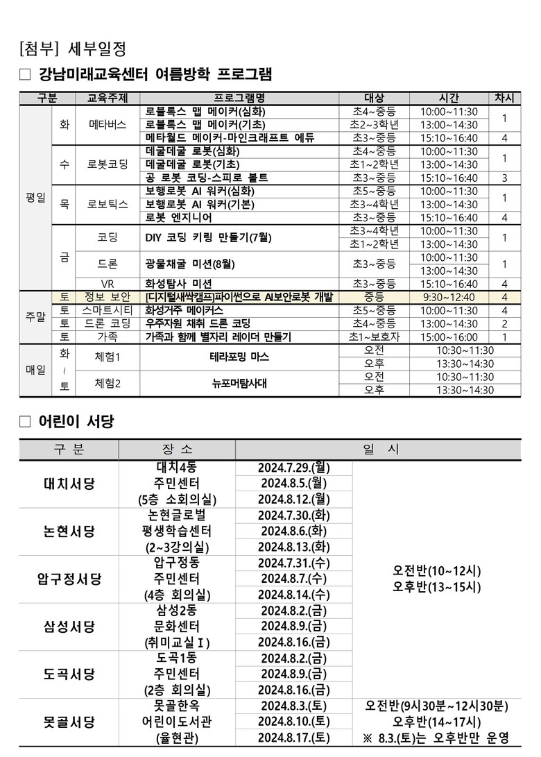 강남미래교육센터에서는 초등·중학생을 대상으로 7월 2일부터 8월 31일까지 메타버스·로봇코딩·AI 등을 주제로 한 여름방학 특별 강좌를 운영한다. ▲로블록스 맵 메이커(기초·심화) ▲데굴데굴 로봇 ▲보행로봇 AI 워커 ▲DIY 코딩 키링 만들기 등의 평일반 ▲가족과 함께 별자리 레이더 만들기 등 주말반(토요일)으로 이뤄진다. 또한 올해 신규 강좌로 과학창의재단과 손잡고 ‘파이썬 AI 보안 로봇’ 제작 과정을 개설했다. 중학생 30명을 대상으로 7월 6일부터 27일까지 매주 토요일 4주 과정으로 진행한다. 자세한 내용은 강남미래교육센터 홈페이지(gangnam.future-edu.kr/)에서 확인할 수 있다.