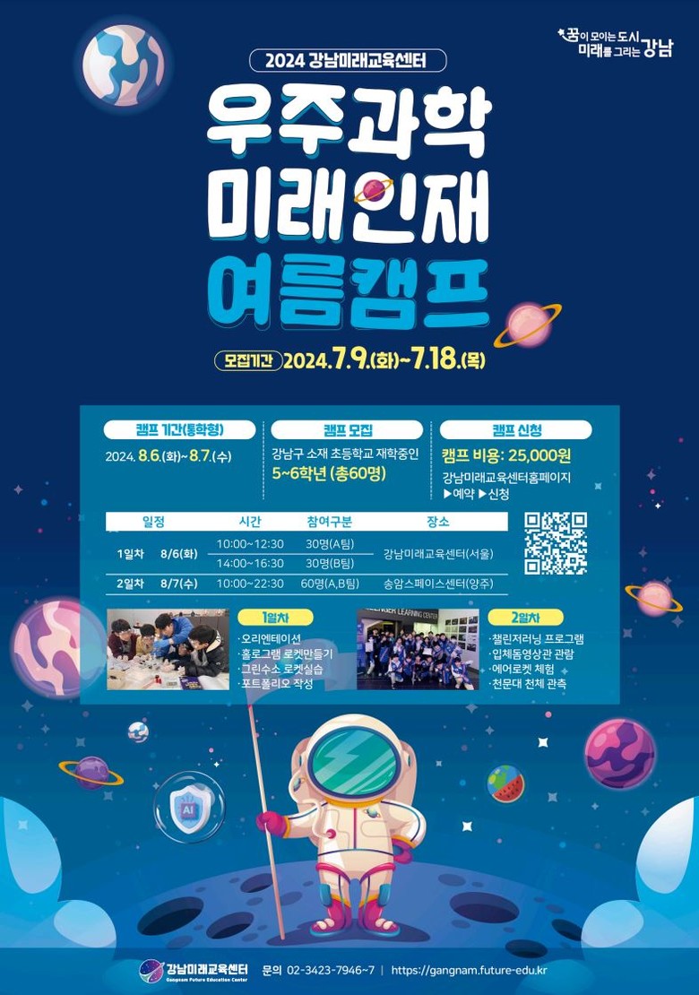 8월 6일~7일에는 초등학생 5~6학년 60명을 대상으로 ‘우주과학 천문캠프’를 개최한다. 지난 캠프의 인기에 힘입어 인원을 48명에서 60명으로 늘렸다. 통학형 캠프로 강남미래교육센터와 경기 양주에 있는 송암스페이스센터에서 진행한다. 천문대에서 교과서에서만 보던 별자리를 관측하고, 우주비행사 체험, 에어로켓 실습을 할 수 있다.
