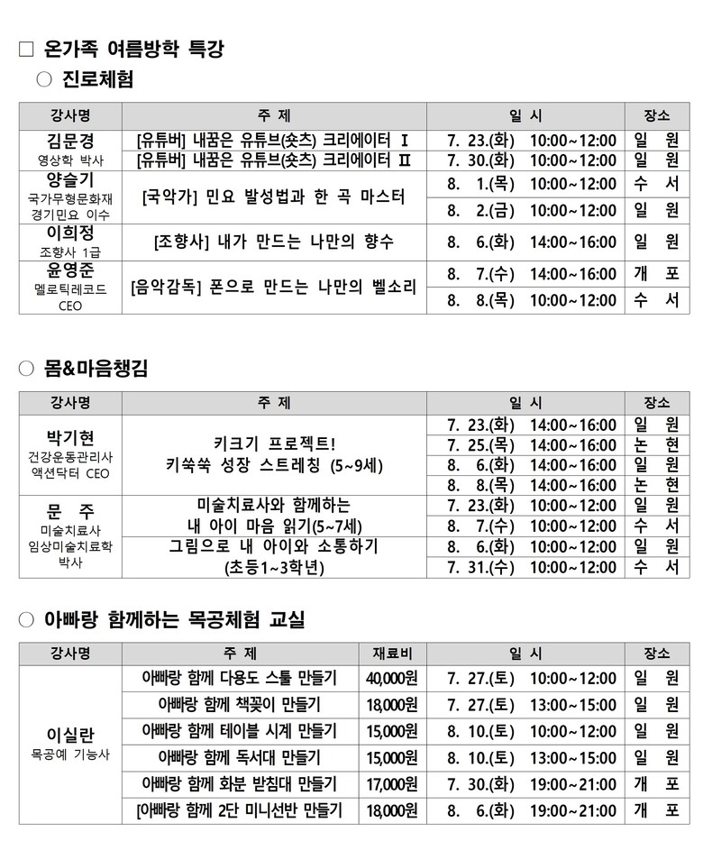 ■ 가족과 함께해 더 행복한 온(溫)가족 여름방학 특강