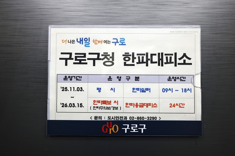 ▲ 구로구청에 게시된 한파대피소 운영 안내문. 한파 대책기간 동안 평시에는 쉼터로, 한파특보 발효 시에는 24시간 응급대피소로 전환 운영된다.