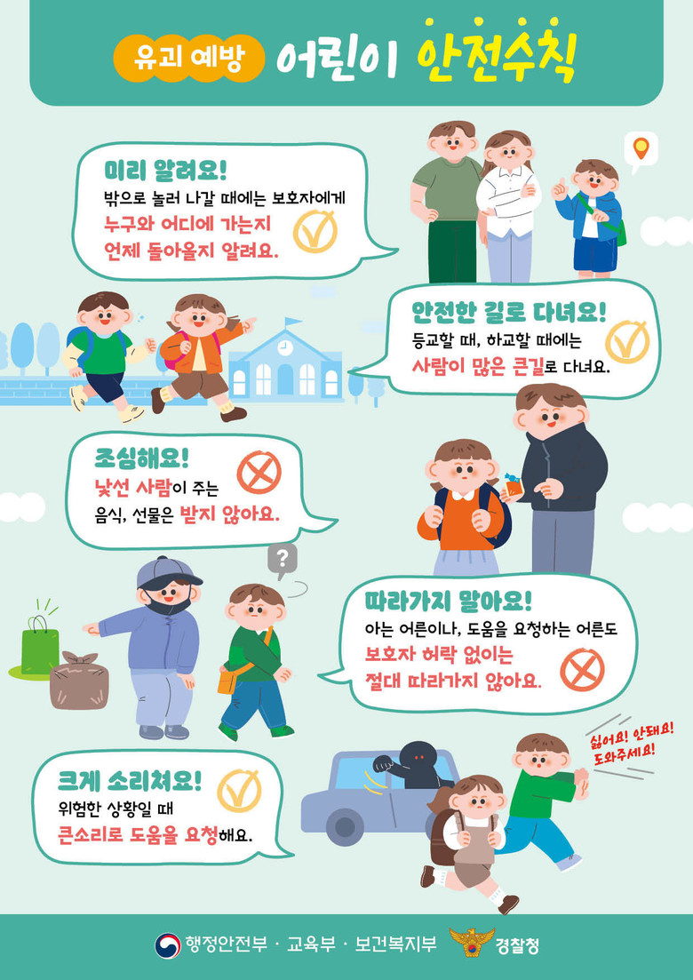 유괴 예방 어린이 안전수칙으로는 ▲외출 시 반드시 보호자에게 목적지 알리기 ▲등하교 시 사람 많은 큰길로 다니기 ▲낯선 사람이 주는 음식이나 선물 받지 않기 ▲보호자 허락 없이는 아는 사람이라도 따라가지 않기 ▲위험 상황에서 큰소리로 도움 요청하기 등이 있다.