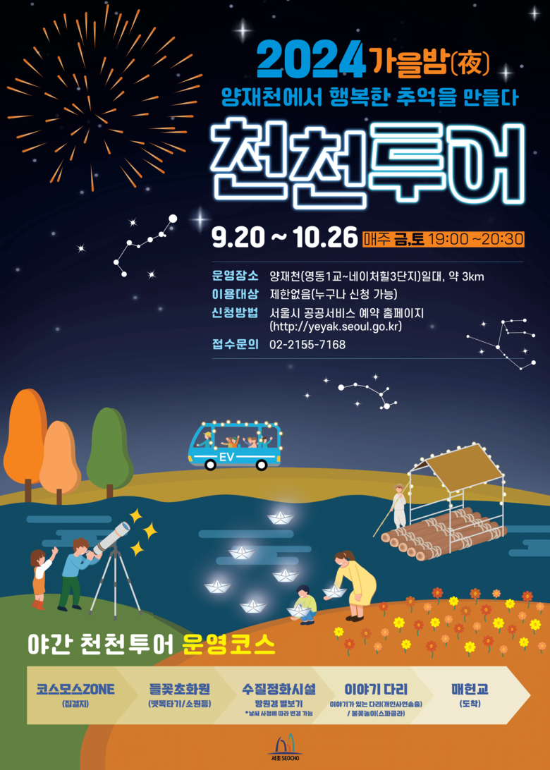 프로그램은 황화 코스모스가 만발한 집결지에서 간단한 코스 및 안전사항 설명을 들으며 시작된다. 조명으로 장식된 14인승 전기차를 타고 시원한 가을 바람을 만끽하며 뗏목 체험장으로 이동, 천천투어 프로그램 중 가장 인기있는 뗏목 체험을 진행할 예정이다. 이후 양재천 수질 정화시설 앞에서 각자의 소원을 적은 종이배 유등을 만들어 띄워 보고, 달과 별을 관찰할 수 있는 천체 망원경도 준비되어 있다.