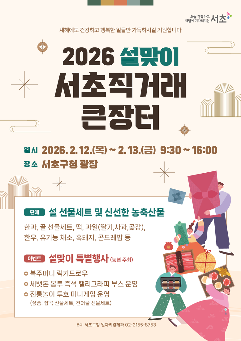 - 전성수 구청장 “장터에서 알뜰하게 장도 보고, 지역경제 활성화에도 힘 보태는 뜻깊은 시간 되길” [서초구 세계타임즈=이장성 기자] 서울 서초구(구청장 전성수)는 설 명절을 맞아 오는 12일, 13일 이틀간 구청 광장과 인근 음악산책길에서 ‘설맞이 서초 직거래 큰장터’를 개최한다.
