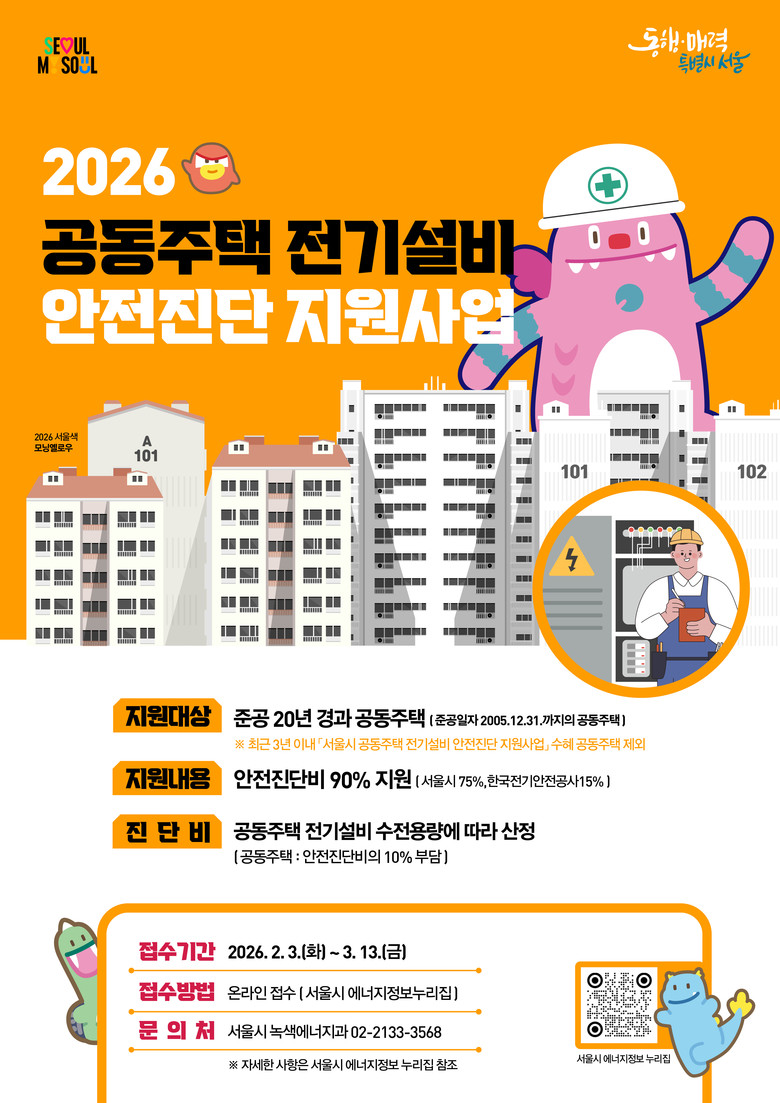 신청은 2월 3일(화)부터 3월 13일(금)까지 서울시에너지정보 누리집(https://energyinfo.seoul.go.kr)에서 온라인으로 받는다. 선정 결과는 4월 중 같은 누리집을 통해 공지되며, 진단은 한국전기안전공사가 수행한다.