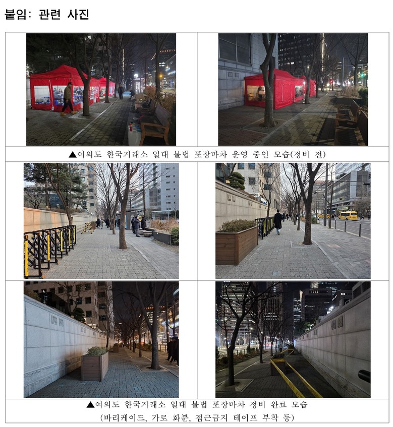 구는 먼저 가로 화분과 바리케이드를 설치하고 접근 금지 테이프를 부착하는 등 초동 조치를 시행해 한차례 정비를 완료했으나, 올해 1월 초 재운영 시도가 이어지자 대응 수위를 한층 강화했다. 전담 대응반을 편성해 8일간 집중 현장 점검을 실시하고, 경찰과 한국거래소의 협조를 받아 바리케이드를 추가 설치했다. 아울러 화분과 바리케이드를 사슬로 연결해 물리적 접근을 차단하는 등 불법 포장마차의 재발 가능성을 원천 봉쇄했다.