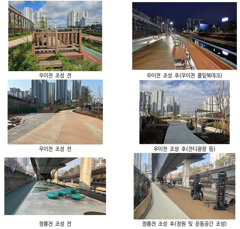 | ▲ 서울 성북구가 우이천과 정릉천변의 노후되고 황량했던 천변 녹지와 산책로를 시민 중심의 생태 휴식 공간으로 새롭게 조성했다. 사진은 우이천, 정릉천의 변신 전과 후 |