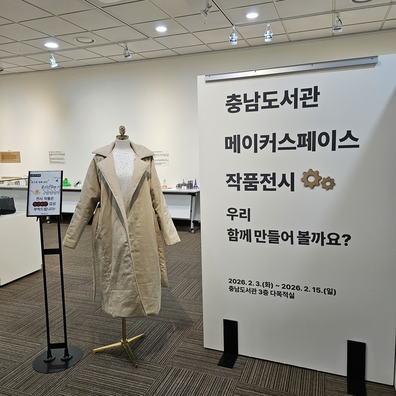 전시실에는 3D펜, 3D프린터, 레이저커팅기, 커팅플로터, 재봉틀 등 충남도서관 메이커스페이스에 비치된 다양한 제작 도구를 활용한 창작물들이 마련돼 있으며, 충남도서관 운영 시간 내에 방문하는 도민은 누구나 사전 예약 없이 무료 관람이 가능하다.