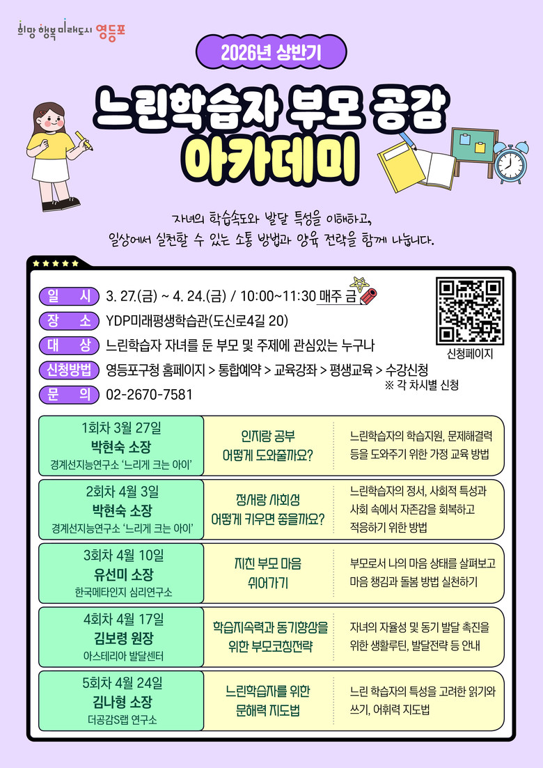 교육은 3월 27일부터 4월 24일까지 매주 금요일 오전, YDP미래평생학습관에서 총 5회에 걸쳐 진행된다. 느린학습자 자녀를 둔 부모는 물론, 관련 주제에 관심 있는 누구나 참여할 수 있다.