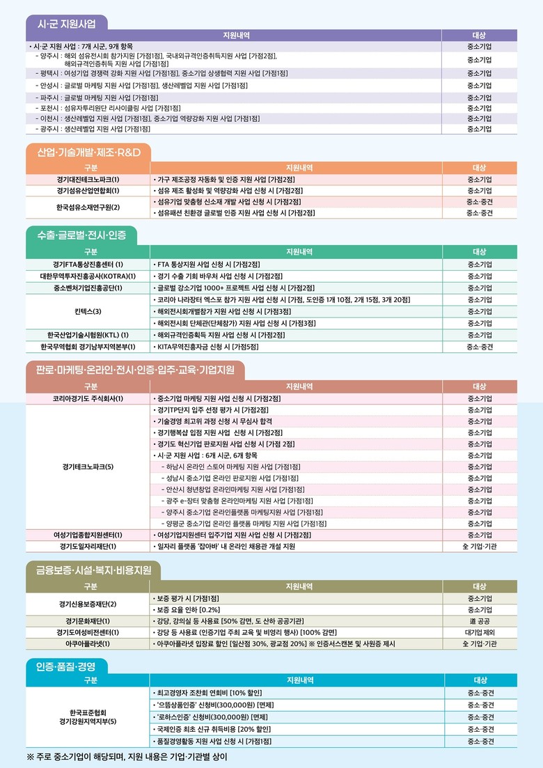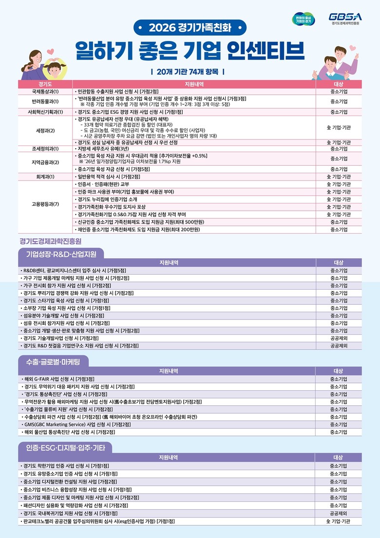 이 밖에도 수출기업 물류비 지원, 중소기업육성자금 등 다양한 기업 지원 사업 신청 시 가점을 부여하는 등 74종의 혜택이 제공된다. 특히 올해는 ‘4.5일제 지원 사업’과 주 20시간(0.5잡), 주 30시간(0.75잡) 형태의 단축근무를 지원하는 ‘경기가족친화기업 0.5&0.75잡 지원 사업’ 참여 기업에도 가점을 부여해 일‧생활 균형 정책을 적극 실천하는 기업을 우대할 계획이다.