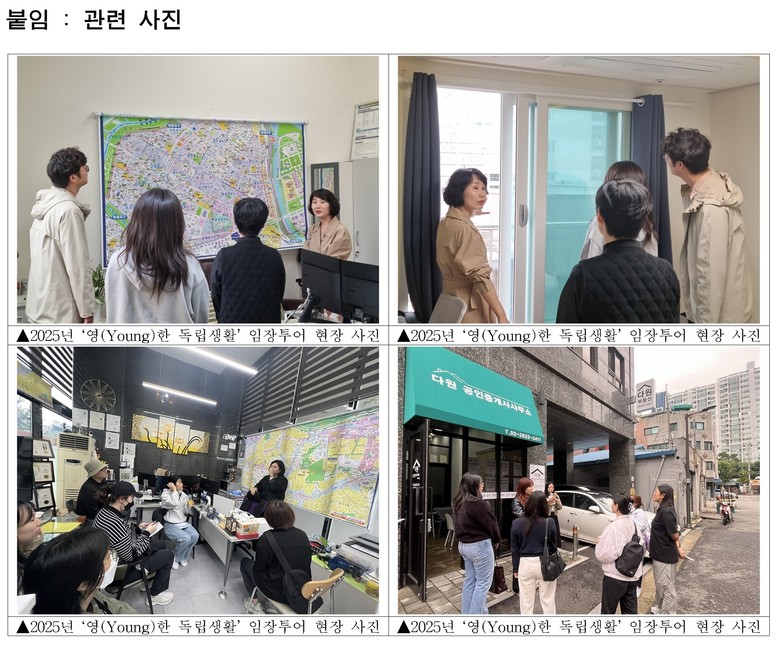 ‘내집찾기 교육’에서는 전월세 계약서 작성 시 필수 확인 사항을 점검하고 직접 작성해보는 실습을 진행한다. 특히, 실제 공인중개사와 함께 영등포구 권역별(당산‧양평, 영등포‧문래, 신길‧대림)로 이동하며 매물을 직접 확인해보는 ‘임장 투어’로 생생한 현장 경험을 제공한다.