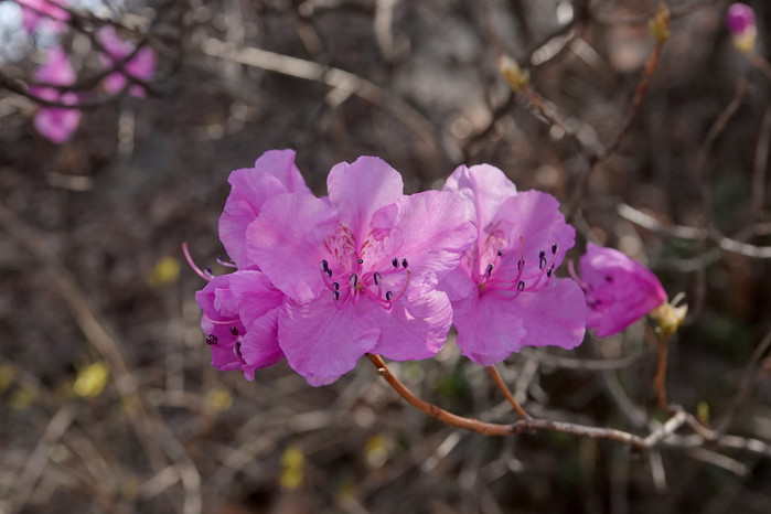 의외로 진달래는 비옥한 토양보다는 산성화된 토양을 좋아한다고 한다. 진달래가 많은 산은 흙이 척박한 상태라고 한다. 화려한 분홍빛의 진달래와 철쭉의 구분. 진달래는 잎보다 꽃이 먼저 나는 대표적인 선화후엽 식물이고, 철쭉은 잎과 꽃망울이 함께 올라온다. 그러니 잎과 분홍 꽃이 같이 피어있다면 철쭉, 가지에 꽃만 피어 있다면 진달래로 생각하면 된다. 진달래가 개화시기가 좀 더 빨라 3~4월 중순경 피어나고, 철쭉꽃은 4월말~5월쯤 볼 수 있다. 철쭉 꽃잎에는 진한 점 무늬가 특징이다. 선녀와 나무꾼 사이에서 나온 딸이 진달래라는 설화가 내려올 정도로 여리여리한 느낌의 진달래는 식용이 가능해 화전이나 비빔밥을 먹기도 한다.