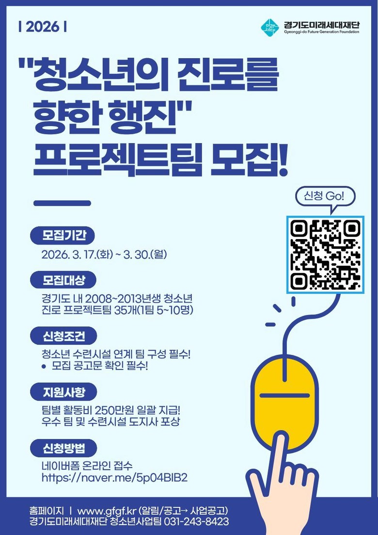 김현삼 경기도미래세대재단 대표이사는 “청소년이 스스로 진로를 탐색하고 다양한 경험을 통해 미래 역량을 키울 수 있도록 이번 사업을 마련했다”며 “청소년이 직접 기획하고 실행하는 프로젝트 활동을 통해 자신의 진로 가능성을 발견하는 의미 있는 시간이 되길 기대한다”고 말했다.