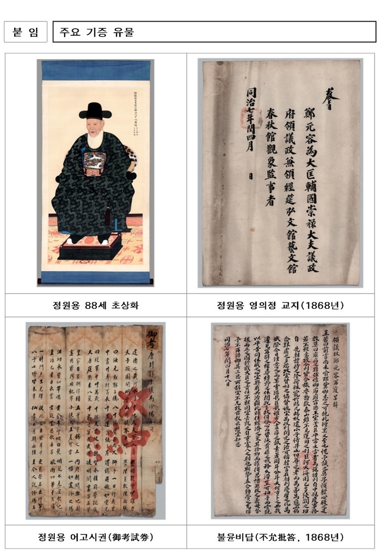 또한 이번 기증유물에는 헌종부터 고종까지 여섯 차례 영의정에 오른 정원용이 사직을 청하였음에도 고종이 만류하며 내린 불윤비답(不允批答) 두 점도 포함되어 있다.