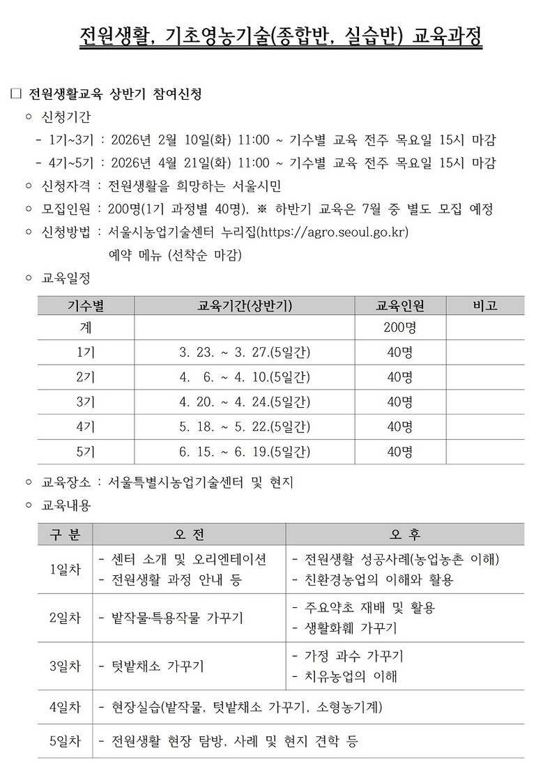 이번 교육은 ▴전원생활교육 ▴기초영농기술교육(종합반) ▴기초영농기술교육(실습반)으로 구성되며, 서울 시민이면 누구나 신청할 수 있다.