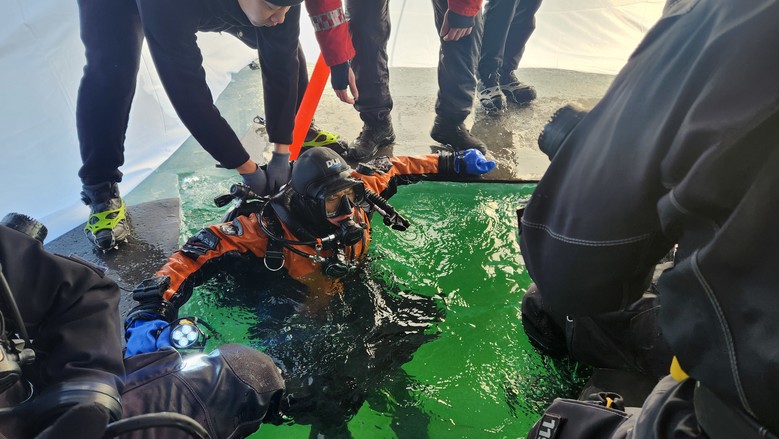 훈련은 동력 절단 장비를 활용한 얼음 절단, 얼음 밑 수중 수색, 지상–수중 간 통신을 활용한 합동 구조 전술 등으로 구성해 극한환경 속 수난사고 대응 능력을 점검하고 실전 전술을 숙달할 수 있도록 했다.