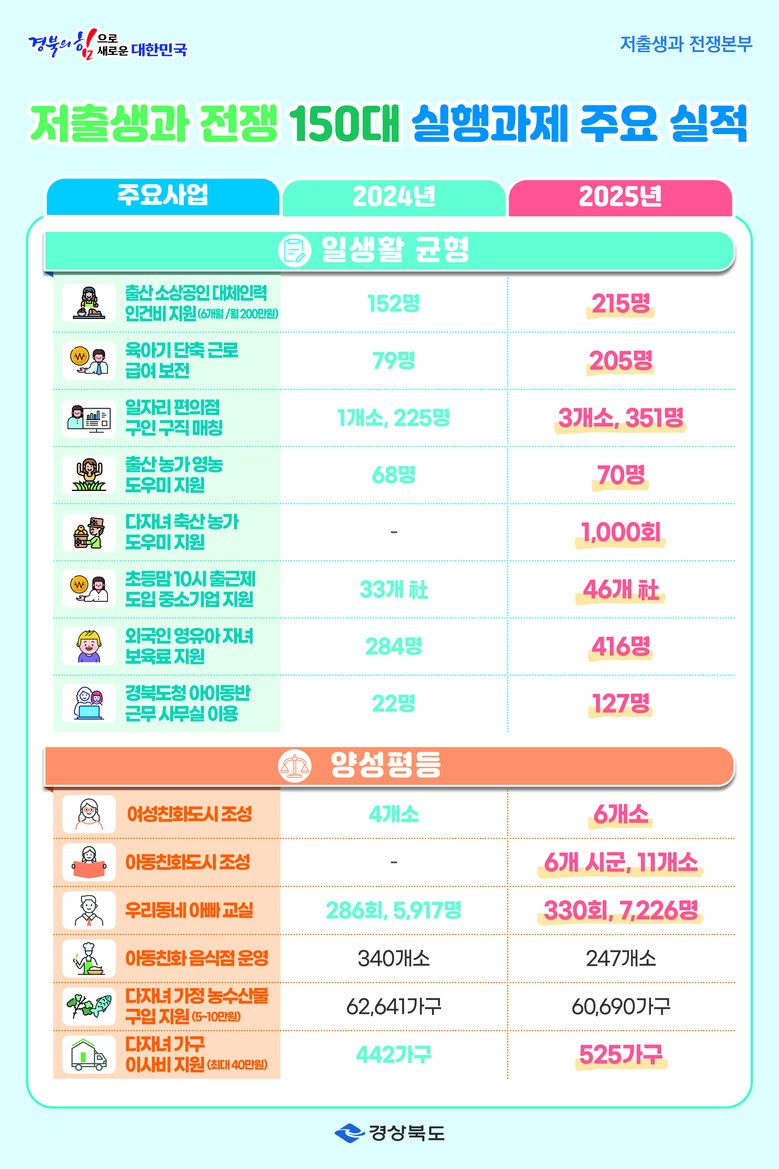 경북도는 2025년에 이어 2026년에는 선택과 집중 전략으로 정책의 완성도를 한 단계 끌어올린다는 방침이다. 체감 효과 중심으로 저출생 과제를 압축·결합해 기존 150대 과제를 120대 과제로 재편하고, 전년 대비 400억 원 증가한 총 4,000억 원 규모의 저출생 대응 예산을 투입할 계획이다.