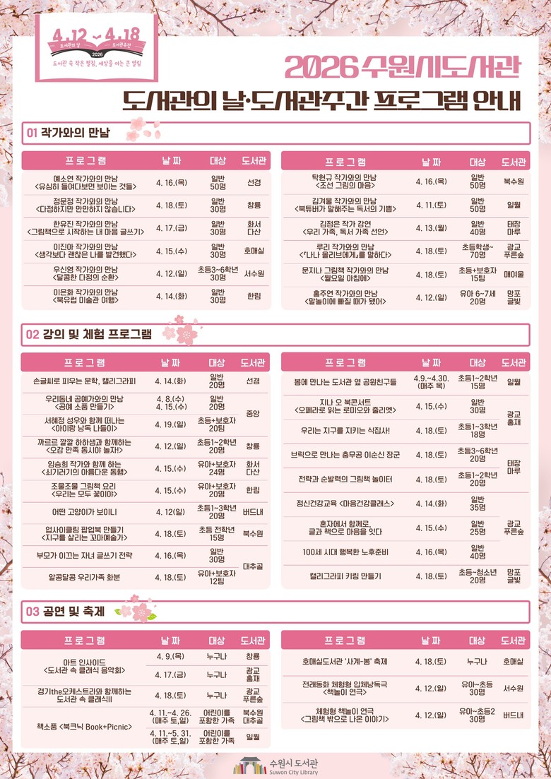 ‘아트 인사이드(창룡·광교홍재도서관, 4월 9~17일)’, ‘사계-봄 축제(호매실도서관, 4월 18일)’ 등 6개의 공연·축제가 열린다. ‘이진아 작가와의 만남(호매실도서관, 4월 15일)’, ‘예소연 작가와의 만남(선경도서관, 4월 16일)’ 등 12개의 저자 초청 강연도 열린다.