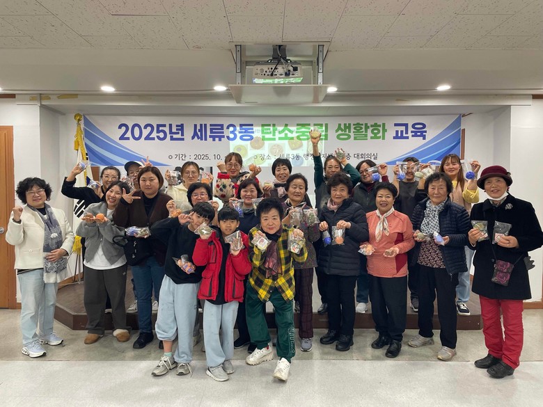 ▲ 세류3동 주민들이 주민자치를 위한 탄소중립 생활화 교육에 참여한 뒤 기념촬영을 하고 있다.