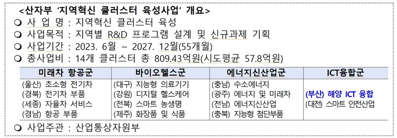 산업통상자원부의 ‘지역 혁신 클러스터 육성사업’에서 부산은 ‘해양 정보통신기술(ICT) 융합’ 분야 사업을 담당한다.