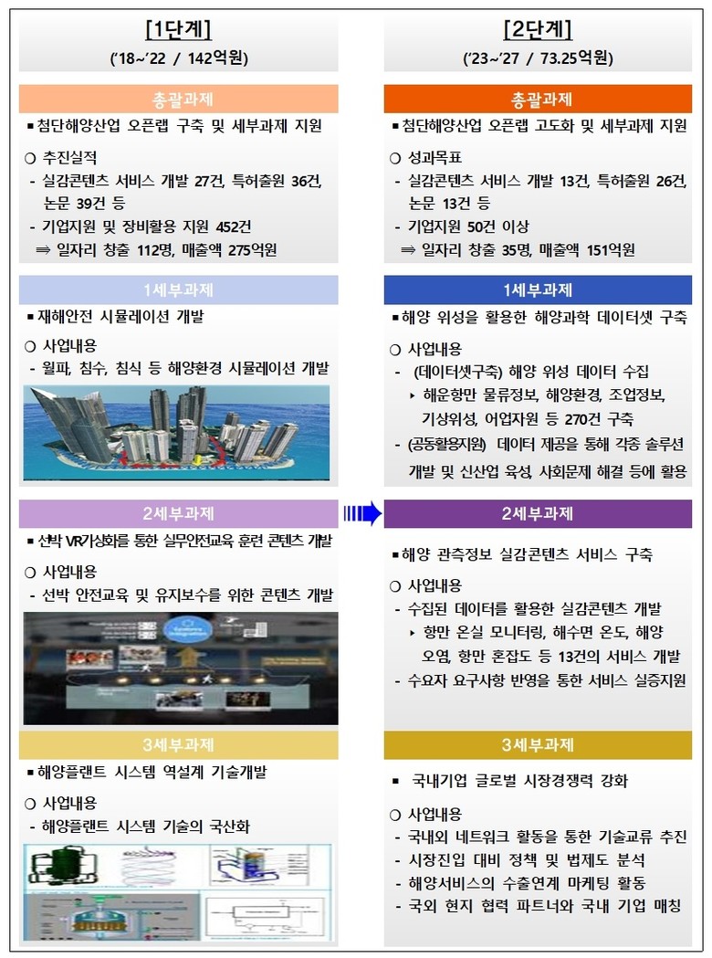 이번 사업에 주도적인 역할을 할 한국해양과학기술원은 2018년부터 2022년까지 해양 분야 정보통신기술(ICT) 융합 1단계 사업으로 ▲해양 재해 안전 모의실험(시뮬레이션) 플랫폼 개발, ▲선박 실무 안전교육 가상현실(VR) 개발, ▲해양플랜트 시스템 역설계를 통한 국산화 사업을 진행하며 관련 산업을 선도해 왔다.