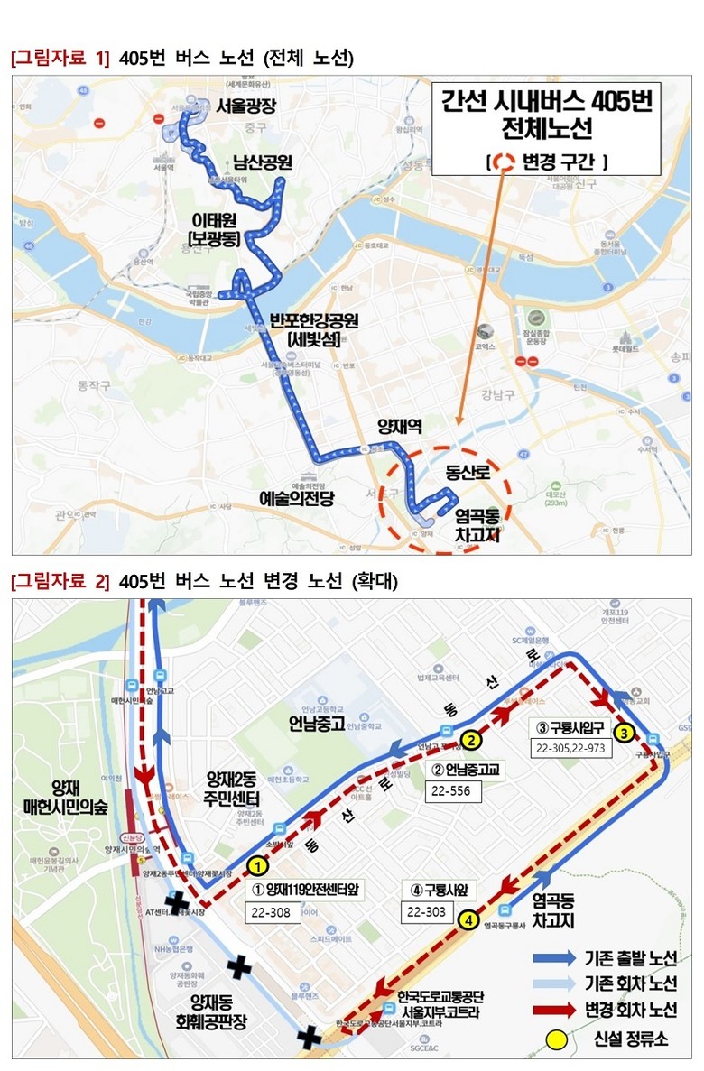 전성수 서초구청장은 “이번 405번 노선조정은 동산로 일대 주민들이 일상에서 겪어 온 이동 불편을 해소하기 위한 중요한 변화”라며 “시행 초기에는 현장 안내와 홍보를 강화하고, 운행이 안정적으로 자리 잡을 수 있도록 불편 사항을 세심하게 살피겠다”고 말했다.